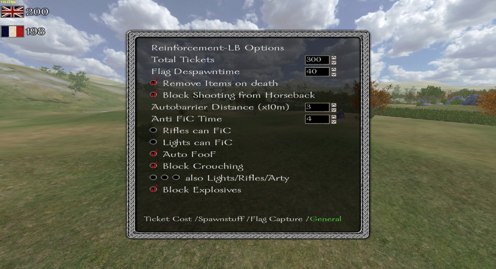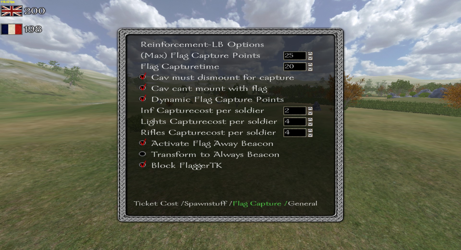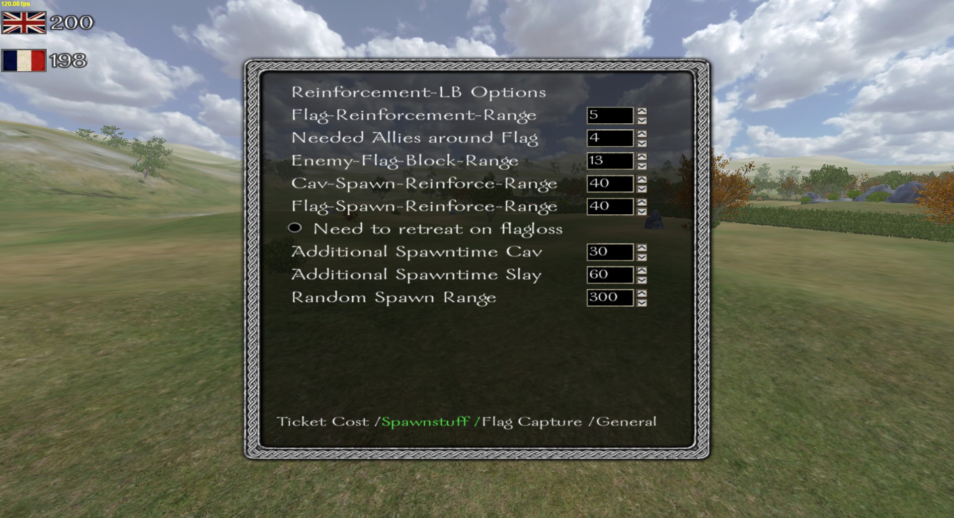 - Flag-Reinforcement-Range: The range in Meters around the flag, where the specified amount allies need to stand, so that you can spawn at the flag.